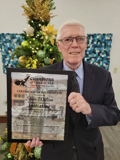 Longtime Edmond resident, Steve Wilson received the Character Council of Edmond's Champion of Character award for initiative on December 2nd. Character Council Vice President, Shermie Potts presented the certificate in an informal ceremony held at Vault 405. Steve’s friend, Robert Rowley, who nominated him for the honor, was present for the ceremony along with Steve's wife, Anita, Character Council President Diane Krakowski and board member, Jim Hulsey.